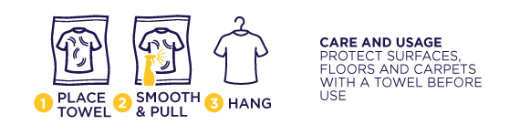 Puneți un prosop sub articol pentru a proteja suprafețele de excesul de produs. De la o distanță de aproximativ 15 cm, pulverizați materialul uniform într-o mișcare de măturat și neteziți și trageți materialul după cum este necesar pentru a îndepărta cutele. Lăsați să se usuce complet înainte de purtare sau utilizare.