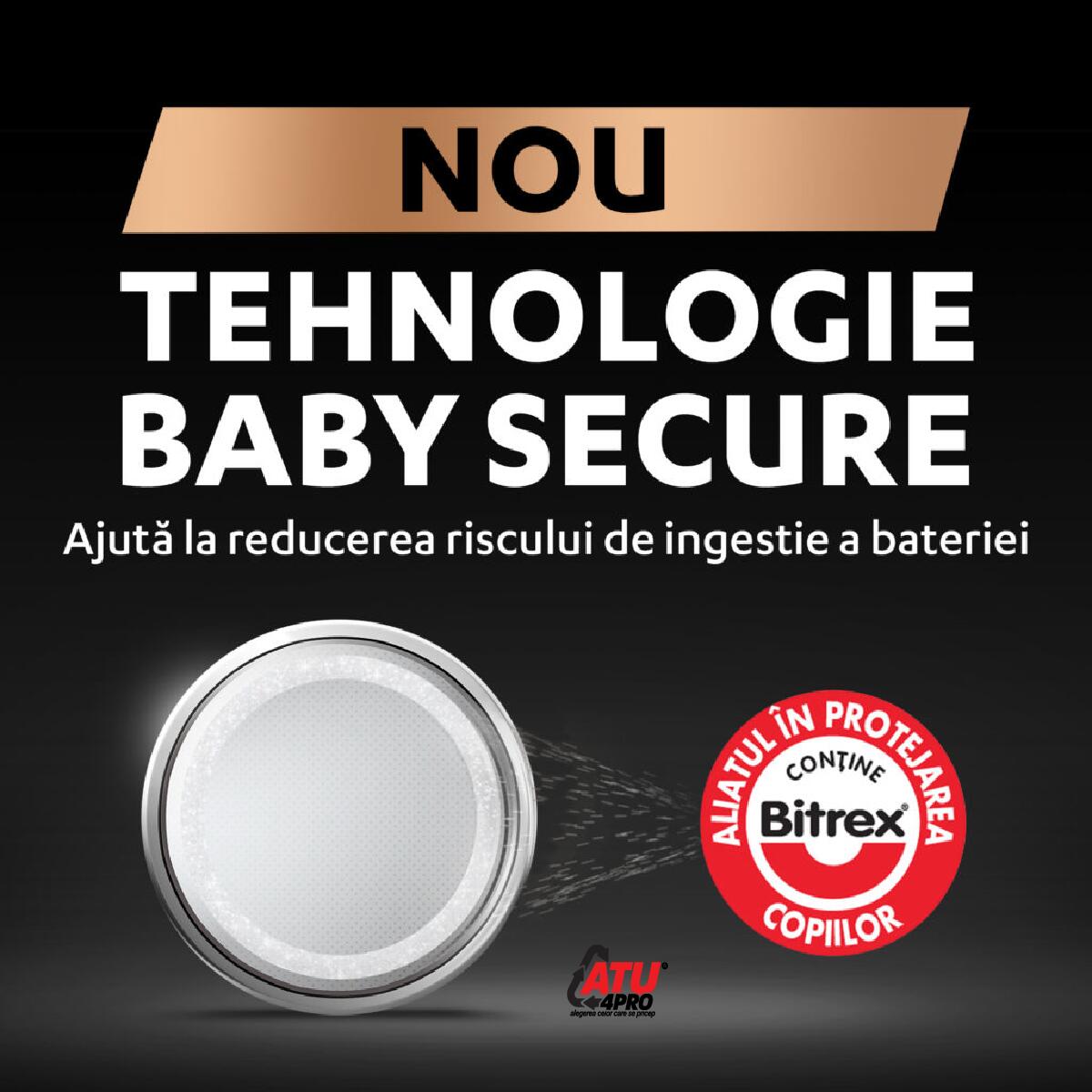 Pentru a ajuta la asigurarea siguranței copiilor tăi și a descuraja înghițirea, Duracell a dezvoltat tehnologia Baby Secure, un strat cu un gust amar aplicat pe partea din spate a bateriei și a conceput un ambalaj impermeabil Baby Secure, cu bule cu aer duble, astfel încât este imposibil pentru un copil să-l deschidă fără foarfece.