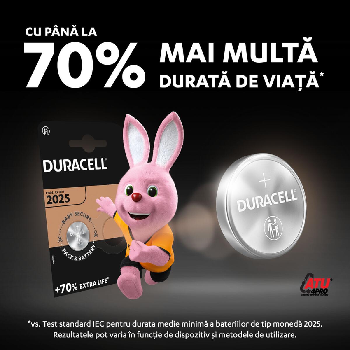 Bateriile tip monedă cu litiu Duracell Speciality 2025 sunt fabricate cu litiu de înaltă puritate cu până la 70% mai multă putere* (*vs. Test standard IEC pentru durata medie minimă a bateriilor de tip monedă 2025.
