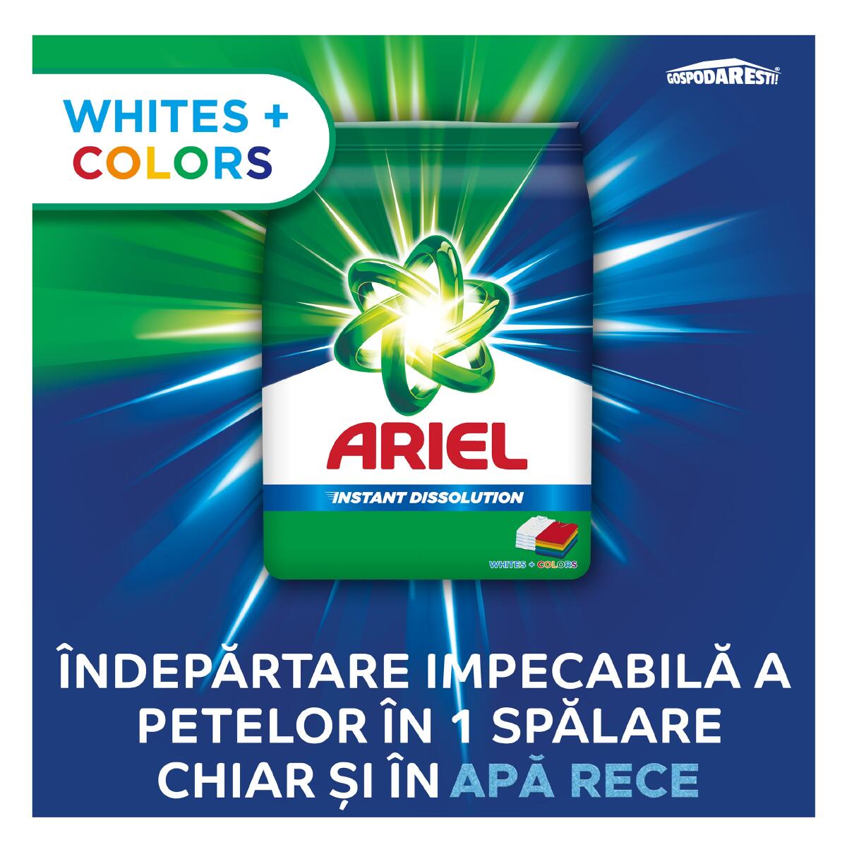 Detergentul pudra Ariel Whites & Colors asigura o putere de curatare mai mare si spala mai multe rufe per kilogram, indepartand impecabil petele dintr-o singura spalare, protejand totodata culorile. Datorita tehnologiei unice de dizolvare instanta, pudra se dizolva rapid in contact cu apa si patrunde adanc in fibre, chiar si in ciclurile de spalare in apa rece.