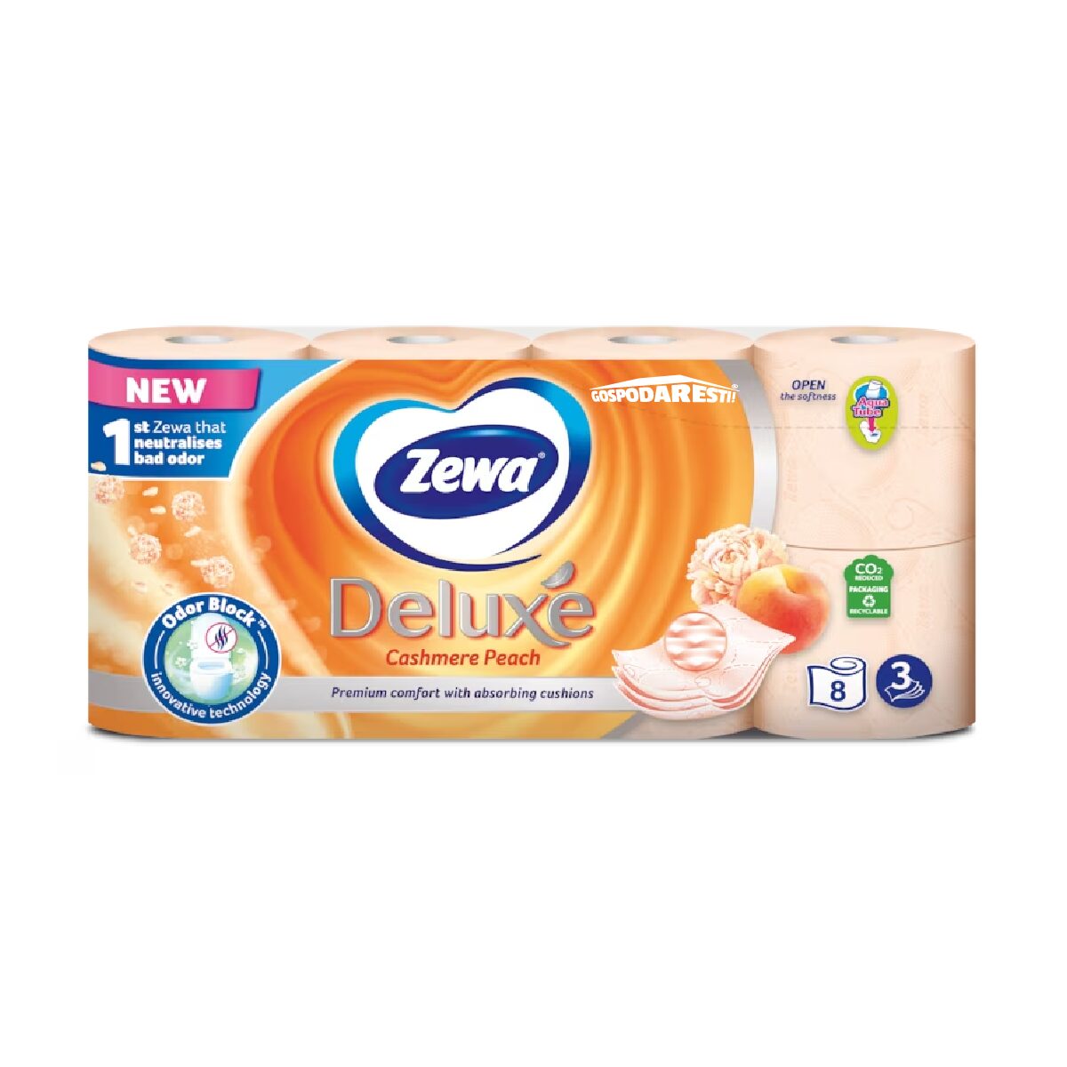 Atingerea delicată a hârtiei igienice Zewa Deluxe Cashmere Peach te face să te simți curat și confortabil, dar îți oferă mai mult decât atât. Tubul AquaTube® dizolvabil poate fi aruncat fără probleme în toaletă. De asemenea, ambalajul hârtiei igienice este reciclabil!