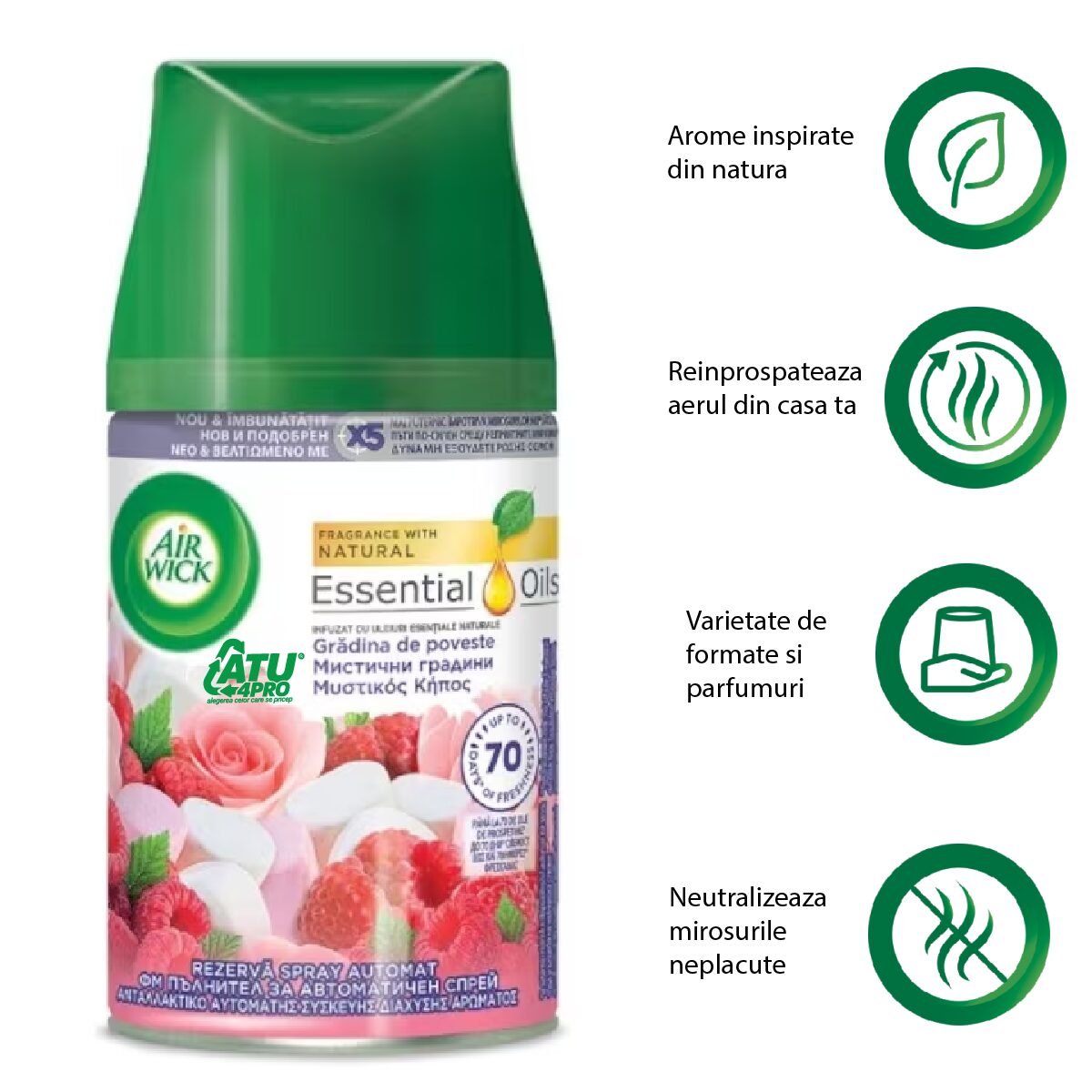 Transformă-ți casa într-un colț de natură cu rezerva Air Wick Grădină de Poveste. Parfumul floral proaspăt te învăluie într-o atmosferă revigorantă și plină de armonie.
